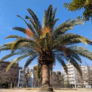 ヤシ科の何か… フェニックスでしょうか? 公園のシンボルツリー 南国のようで素敵です💕 花と実がついていました😄