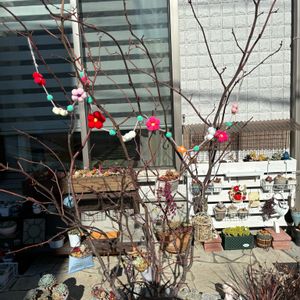 デザートローズの鉢には年行事毎に飾りを変えています。 今回は2月を意識して梅と椿の造花を組み合わせてみました。 毛糸玉の多肉ちゃんにも梅に見立てたピックを作って挿しました。