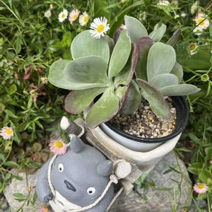 おはようございます😊 トトロさんに背負ってもらったのは、去年秋に胴切りしたデザートローズです。 3つに増えました😀 でも、綺麗に赤くはなっていません😅 冬に期待! 🏷️毎月16日はトトロの日に参加します。