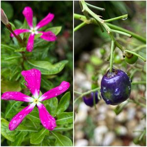 雨上がり雫💧輝いてます༄キラリ ①日々草🌿 花姿が大の文字、、花びら細く繊細な感じが良き〜🌱種蒔きっ子 キキョウラン🌿(ディアネラ・カエルレア✨) お花もいいけど実🟣まん丸可愛いリズムになる〜🎶発色も良き♡ ②八重咲きブーゲンビリア🌿 白い花びらに時々ピンクも入り優しく爽やか✨ デザートローズ🌿 GS pic📸✨で初めてお花見て👀凄い👍〜 実物のお花見たくなり楽しみになりましたー🤗♡