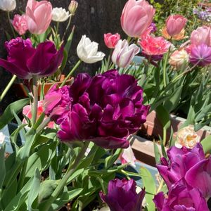 暖かい日差しが届いています☀️ 雨上がりのチューリップが元気に**✿︎❀︎🌷 紫色の八重咲きチューリップが綺麗💜 奥には色とりどりに咲いています 穏やかな一日をお過ごしくださいね。゚✶ฺ︎.♡