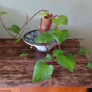 お芋のベニハルカさん🍠💕 素敵なインテリアになってくれていますが お水だけなのにどこまで伸びるのしら〜😲 お芋は❓ まさか生らないですよね〜😅❣️