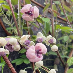 こんばんは⭐️ 山野草の時間です⏰ アケビ🌸 とっても可愛いお花が咲いていました。 大きい方が雌花 小さい方が雄花 ちょっと咲くの早いんじゃないかなぁ😅 雨の中の散歩も割と楽しい🐕 でも土日☔️は辛いな〜💦