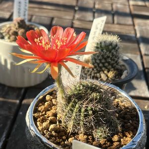 オレンジ花が咲きました(写真1) 札なしのサボテンです SNSにおける花や本体の類似性から花房丸としているサボテンです 雌しべの先端は5つに分岐しております(写真1) 群生して、円柱状に生育し、先端はやや尖っております(写真2) 花梗の基部に綿毛はないようで(写真3、4)、刺座の上方に生じる小粒子が大きくなって蕾になるようです(写真5) このようにこのサボテンは旧レブチア属の特徴を持っているようです 20250719撮影