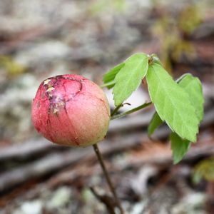 これは何❓ ツボミ❓ 実 ❓ 野草を探していて、山の小径で見つけました。😲 高さ10㎝位、丸いのは2㎝位、地面から針金の様な茎が立ち、丸いのはその天頂に直に付いてます。丸いものの直ぐ下の茎から枝が出て葉が付いています。葉は柔らかくうぶ毛がありました。 木が発芽したようですが、啄くとブラブラ揺れて、割としっかりしているようでした。 こころあたりのある方は、教えて下さいませ。(ᐡᴗ ̫ ᴗᐡ)ぺこり 教えて頂きました。 この赤い物体は、今流行りの「虫こぶ」なのだそうです。コナラ(葉はコナラ)の枝の先端にナラメリンゴタマバチの寄生による虫こぶと確認しました。 ありがとうございます⸜(*ˊᵕˋ*)⸝💕✨