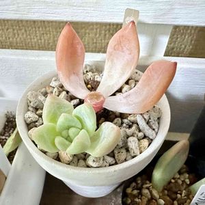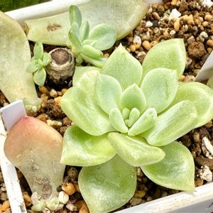 エケベリア『マチルダ』の逆交配の子。 5cm鉢から6cm鉢へ鉢上げ。 チョンパした頭が立派に♪ 葉挿しも元気に育っています♪