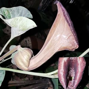 アリストロキア マクロウラ 久しぶりの開花!🏵 そして相変わらず臭い…🥴 長くの伸びてる紐みたいなのは約50cm❗ ジャコウアゲハの幼虫が大量… 放置すると葉が消える…😑