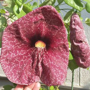 庭からなにやら臭い匂いがすると思ったら、、、咲いておりました。 アリストロキア.ギガンテア でかくてキモいです。