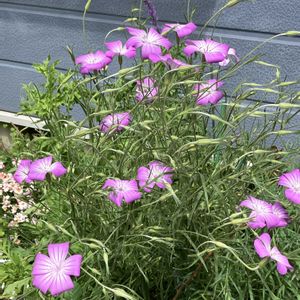 イマニワ♪ ①〜④アグロステンマギタゴ 風になびいてゆらゆら🩷 ⑤リナムブルードレス咲き始め👗 どちらも頂き物タネ🎶🙏 直播もポット撒きもたくさん発芽しました😊 春らしい優しい色が穏やかにしてくれます🩷🩵