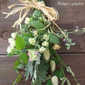 剪定を兼ねて フレッシュのスワッグ作りました🌿 とってもいい香りがプンプンします♫♬ オレガノケントビューティー セントーレア アメリカンリッピア キャットミント ラベンダーエーデルワイス ラグラス ヒメノキシス
