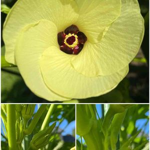 『今日の花💛🍃』 『オクラの花と実とバッタ💛🍃💚🍃』 オクラ花が綺麗に咲いてます‼️ オクラの実もなってます‼️ そしてバッタさんが 遊びに来てました😆✨✨