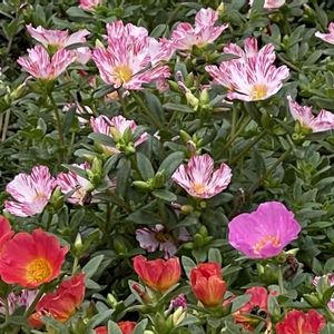 変わり咲きポーチュラカ。6種の中の4種が咲きました。 花びらが2色になっています。 右下の白地に赤いしぼりが入った花びら🌸 がカワイイですね😊