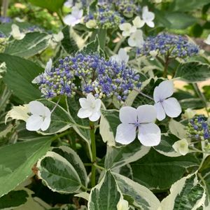 ガク紫陽花 恋路ヶ浜 水彩画のような美しい斑入り葉と、青い小さなお星様が白い額(ガク)で囲まれた花 たくさんある品種の中でも一番のお気に入り✨