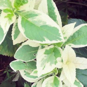 斑入りのガクアジサイ 恋路ヶ浜 白く明るい葉っぱが広がってきて、庭の一角がパッと明るく✨