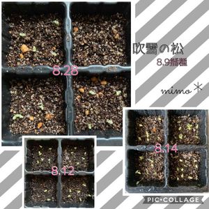 8月半ばに種まきしたフライレア、ようやく3㎜くらいになりました☺️ 吹雪の松は、試しに植えたのがほぼ全滅したので、今度は種まき用の土で植えてみました😅 1週間ほどでここまで育ちました🎵 ここからが勝負ですね💦