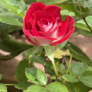 遅咲きの薔薇、岳の夢が咲いています😊いかにも薔薇らしい咲き方で赤い花びらの外側が白です💕消毒無しでもツヤツヤなお利口な子💓 ネットから。 岳の夢 ストロベリー&ホワイトの色鮮やかな花色で、たくさん蕾を付ける花束のような可愛らしい品種!花もちもよいです。うどん粉病・黒点病に強く、耐寒性・耐暑性もあるので、育てやすく初心者の方にもお勧めの品種です。ヨーロッパでもさまざまな賞を受賞している、優れた品種です。2009年ADR、他多数受賞。