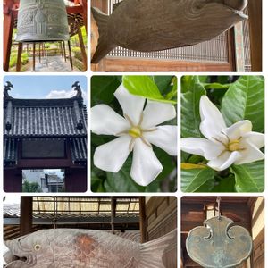 京都 NOW 萬福時のクチナシの花。 雲版雲の形)、開ぱん(魚の形)加えている玉は煩悩珠だって!