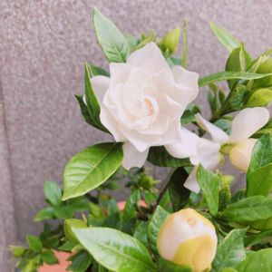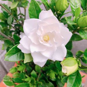 🎼くちなしの花の〰️花のかおりが〰️〰️♪・・ くちなしの白い花〰️♪ 思わず口ずさんでいます♪ 緑の葉に真っ白の花が良く映えて甘い香りを漂わせてくれます。 咲き始めは真っ白 咲き進むにつれてクリーム色かかってきて 最後はカスタードクリームのような色になって萎れます。 花は短命です。 春の沈丁花、夏のくちなし、秋の金木犀 が三大香木と言われ それぞれとても良い香りにうっとりします🎵🎶 花言葉 とてもしあわせです。喜びを運ぶ。洗練。優雅。