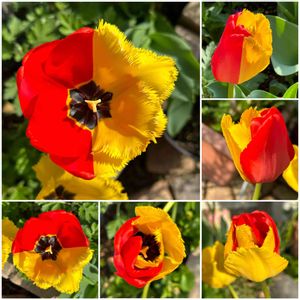 2024.4.11 Thursday ☀️ 空気がひんやりして気持ちの良いお天気の朝です。 昨日に引き続き、我が家の小さな庭の小さな花壇に咲いている、わたしのビックリニュースは、花びらの色が黄色と赤色の半分こで咲いたチューリップです。 今日は全開したので、真上から撮ってみました。 6枚の花びらは、 黄色のフリンジが2枚 赤色が2枚 黄色のフリンジと赤色が半分づつの2色が2枚 それも 黄色と赤色と半分づつの3枚が、内側と外側ににそれぞれあります。 綺麗に半分こ です。 4枚めと5枚めは、一緒の花壇に植えた黄色のチューリップと赤色のチューリップです。