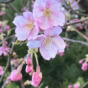 2024.2.21 Wednesday ☂️ 小雨降る水曜日です。 昨日が暑いほどの気温だっので、急降下の今日はだいぶ寒く感じます。 お孫ちゃんのお迎えに行ったら、門の外に河津桜らしきピンクの桜が咲き出していました! これは、河津桜じゃないですか? とってもラッキーな出会いです。 小雨に濡れるのも恐れずに、携帯取り出してパチリパチリしちゃいました。 メモ(忘れないように) 🌸河津桜(カワヅザクラ) バラ科サクラ属 日本固有種のオオシマザクラとカンヒザクラの自然交配種 2月頃に開花を、初めて1ヶ月ほど開花する。 ソメイヨシノと違い、雨や風にとても強いそうです。