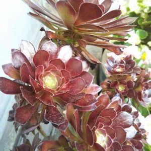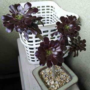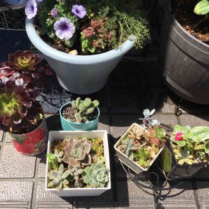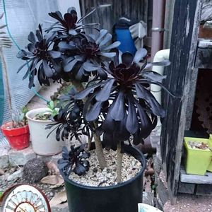 【多肉植物】 我が家の"アエオニウム" 寄植えよりはお一人様のが元気みたいですね。 奥の大きいのは斜め前のおばあちゃんが、 投げ入れてくれたもので、 まだ根が張っていません。 アエオニウムは頭が重たそうですが。。。