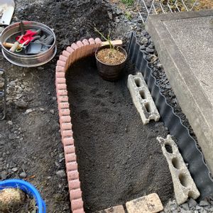 今日はとても暖かくて土掘り日和でした♪排水管の関係と、もうすでに伐採された何かの木の切り株とその根っこが邪魔しておりまして、これくらいが精一杯。本当に小さな花壇になりそうです。 やっと瓦礫を放り出し、振るった土を戻したところまで来ました。半地植えにしようとバラの鉢を置いて、えっとこの子名前なんだっけ??マチルダかな?咲くまでのお楽しみにします。 花壇の方は、この後バーク堆肥と、根腐れ防止材と、腐葉土と赤玉土を入れて混ぜ混ぜする予定です。