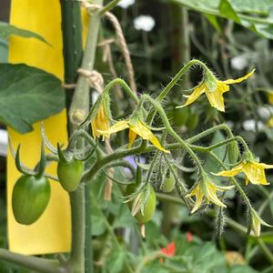 アイコ(ミニトマト)です🍅✨ 4月末種まき→6月中旬花咲き→6月下旬実がなる→7月中旬実が増殖中です。 黄色い実も出て来て、収穫が楽しみです😉