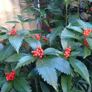 今日から12月! 遮光ネットを上げてチェック👀 千両がきれいに色づいていました💕 年末になるまでもう少しの間ネットの内で待っててね✌️ 残った🔴は🐦️さんの🍴 センリョウ科 センリョウ属 花期 6〜7月 果期 11〜1月