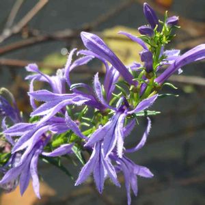 サワギキョウ 水辺にまっすぐ立っている。ずいぶん背が高いなぁ、と思ったが2mを越すものもあるそうだ。 3つに裂けた下唇の左右に細く深く裂けた上唇、縁に白い毛が生えて興味深い。金曜日の蕾たち🏷️