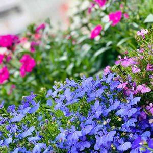 ✨ロベリア✨ 眩しいほどの紫のロベリアが華やかです💜その向こうには、撫子のピンクが💗 散歩道、癒されて帰って来ましたよ( ⸝⸝•。•⸝⸝ )♡ 別名:ルリミゾカクシ」「ルリチョウソウ」「ルリチョウチョウ」 原産地:南部アフリカ 花言葉:「謙遜」「悪意」「いつも愛らしい」「 人目につく」