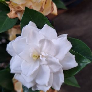 クチナシの花 薫っています😊💞 植木市にて6号鉢クチナシの実を目的に買いました。そのときは花芽だけでしたので、薔薇のような美しい花が咲くとは知らずに。サプライズ🎵😍🎵 植え替えて初めは庭に置いていました。しかし花が咲くと間もなく茶色にいたんでしまいました。 花が風で揺れて葉っぱにあたる刺激ですぐにいたんで茶色になるとわかりました。 室内に移動。ここでは茶色になることなく、何日も真っ白をたもって咲いています😊クリーム色に変わっていきます。
