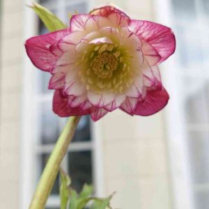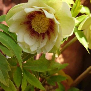 ゴールド入りのオフホワイトに赤いスラッシュが入ったクリスマスローズ