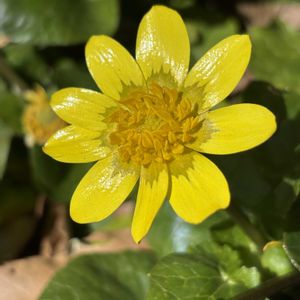 ヒメリュウキンカ(姫立金花) 太陽に照らされてキラキラ光っています。2025.2.11(火)建国記念の日 坂田が池総合公園 風の強い寒い日だったのに家族連れが多かった。 県立房総のむらの帰りに寄ったのでお昼になり、すぐ帰宅。