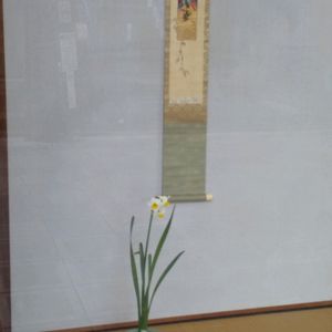 お雛祭りのようなお軸 水仙♪ 青磁の花入 矢筈板 2023.2.17