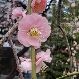 2/14㈬① 昨日桜神宮の後、世田谷松陰神社に行ってお墓参り。行ける時は1日15日にお参りしますが、15日から入院なので早めに😊 思えば初詣に1番に松陰神社に行ったら、御神籤で家移り吉と出て、狛江市ではなく世田谷区に新居が見つかりました。 なのでそのお礼を! ありがとうございます!! ご近所の方々とも上手くいきますように見守ってください とお願いもして、 お墓にもお花をお供えしてきました。 それから世田谷区役所から梅ヶ丘までバスに乗って羽根木公園に行きました。 世田谷梅まつりの会場ですが、テントのお店は土日祝日だけ開店するみたいで、閉まってました。 初めは藤牡丹枝垂れと紅千鳥。梅の花なのに、藤も牡丹も入った名前で、華やかですね〜✨✨どんだけ~!! それほど混んでなくてスイスイ進めました。梅まつりに行けて良かったです☺️🩷💞