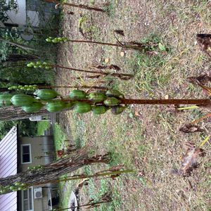 ヒマラヤウバユリの実 前回来た時 倒れていた一本も 大丈夫なようで実が大きくなっています。 花が咲かなかった株は 葉が見苦しくなったのか除けてありました。 ウバユリ 沢山の株が実を付けています。
