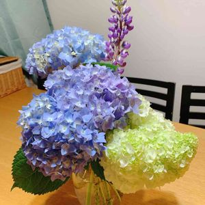 花が咲いて重たくなり過ぎた紫陽花を切って部屋で楽しみます☺️ 四季咲き紫陽花 霧島の恵 柏葉紫陽花 ハーモニー 種から育てたルピナス(別名ノボリフジ)
