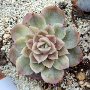 【エケベリア・スノーボール】☃️ 赤爪サマたちとはまた違って、やさしい色合い✨ 色白の中にも淡いピンク🩷 夏はぱっかんでしたが、この寒さで中央からキュッと引き締まってきました。 🍏