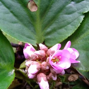 🍀ヒマラヤユキノシタ🍀 誰ですかこんなに穴を開けた犯人は❓🤔🐛🐝🪲🦗🪰 沢山の穴があいています・・・😱 今は硬い葉っぱだけど新芽の時は美味しいのかもね。🌿 でかくなりすぎた葉っぱを カット✄しすぎたから 今年は咲かないかもしれないと思っていました。😅💦 🏷19日はピンクの日 🏷蕾応援団 に参加させて下さいね。