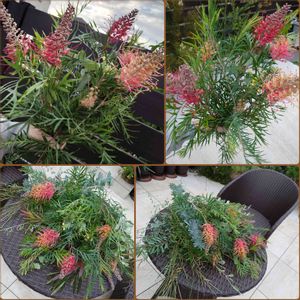 剪定して花束作りました💐 おかげで もさもさグレビレアが すっきりしました~ You Tubeで冬対策(冬前)に 剪定が必要というのをみて やってみました😄 四季咲きなので切るタイミングなく お花を捨てるのもったいないので お友達に声かけました😆