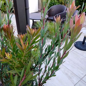 蕾祭り 地植えプロテアはネリィ、スペピンなど10個、高く高くなった株を長い間我慢我慢で切らなくてよかった😄 鉢植えスサラ剪定後また蕾が3個💕 冬に黒くなったつぼみの中から鉢植えリトプリの芽が出てきました🩷 そしてコレアアルバもつぼみちゃん ジュリエットとピクシーは日照不足かな、葉のみを茂らせております😅