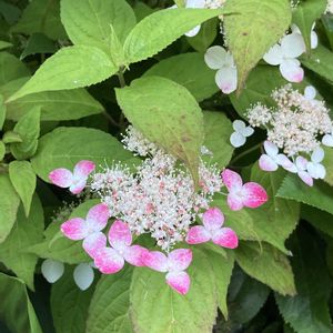 ヤマアジサイ くれない 紅 まだ白い花と 色づいてきた花と… 鉢植えの親株は色好きが早い