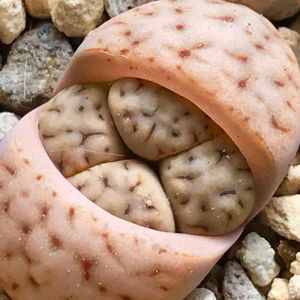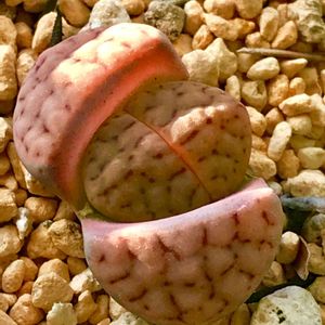 リトープス 富貴玉 C142Bです。夏・秋の長雨で水の管理に苦しみ、私が持っているリトープスで最も伸び上がった個体になってしまいました。 母に「猿ケツ」というなんとも言えないあだ名をつけられています。