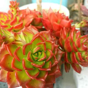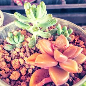 放ったらかしの鉢からプチプチ生える多肉達♡ 写真下側のやつが今のお気に入りです。 黄緑にピンクが可愛い♡