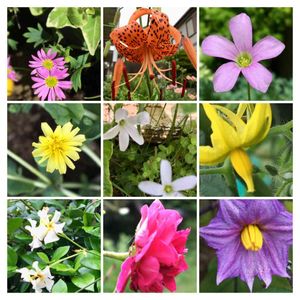 こんにちは☀️ 久しぶりに太陽が… ②ご近所で見かけたお花をコラージュ🌸 ぶどう ワスレグサ ホタルブクロ ガクアジサイ ムラサキゴテンの花 シモフリマツヨイグサ イソトマ ユリ ぶどうは毎年 オブジェのようにエントランスに🍇🕊😅