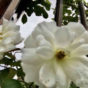 おはようございます☔️ バラ ホワイトニュードーン2番花 この天候の中…咲いてくれました 高いフェンスの上で気付かずに咲ききって お花はやはり…癒されてくれますね 咲いてくれただけで⭐︎⭐︎🤍💕 良い一日を