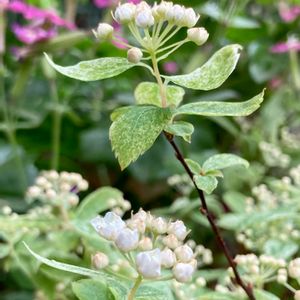 こんばんは〜🍃 今日のお花 コデマリ お庭の斑入りコデマリ ピンクアイスが咲き始めました✰⋆。:゚・ꕤ* 斑入りもちょっと特徴あってピンクを帯びた白く明るいグリーンに斑がスラッシュ状に入って🌿 蕾はピンク色でお花は白花ポンポン咲💞 お花ない時もカラーリーフで楽しめます🌿🍃 昨日よりの強風 今夜からの暴風雨に備えて鉢移動🪴🪴🪴 良い週末をお過ごしくださいね♪