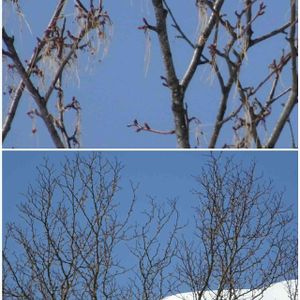 2023.6/21 ウダイカンバかも🤔 ❌糸の様に見えたのは種が付いていた軸の部分でした。 糸の様に見えたのは雄花序の跡と果穗の跡だと思います。 雄花序の3個の冬芽の様子や若枝の樹皮の横に長い皮目、老幹の裂けた感じの様子からミズメではないでしょうか?(4/22)