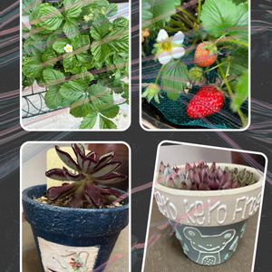 おはようございます😊 まだ雷注意報が出ていますが、今はやっと小降りになりました。 🏷毎月15日はいちごの日に参加します。今朝の🍓4つ目の実❣️だんだん甘くなってきました。サントリー本気野菜蜜香です。 自然暮らしさんの肥料も効いてきたのか、となりのワイルドストロベリーもたくさん花が❣️ みなさまから頂いているたくさんのリメ鉢やリメ缶を紹介出来てないので、少しづつpicさせてくださいね。 今日は、mimimiさんからのリメ鉢に、みどりさんから頂いた紅司とたかさんから頂いた鉢には、メルカリで買った名前わからないコたち寄せ植えです。