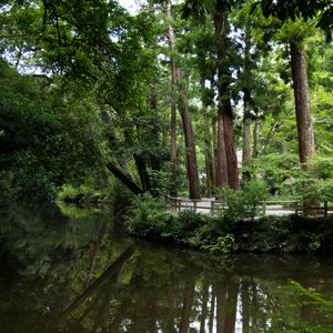 伊勢神宮 外宮 正殿前の池に映える神様の森 今年二回目のの参拝に行ってきました。鏡の水面に神様の森が映っていました。